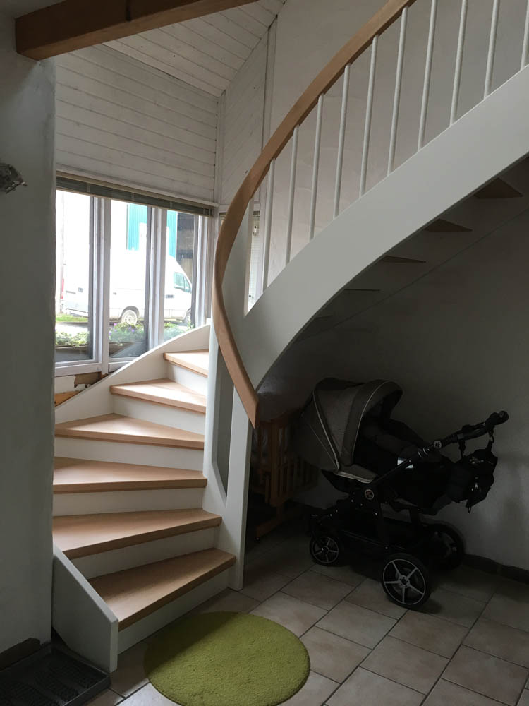 Treppe Landhaus – halbgewendelt – Stufen und Handlauf in Buche Natur geölt = Geländer mit Krümmlings Pfosten + Wangen + Setzstufen in weiß-lack RAL-9010 lackiert